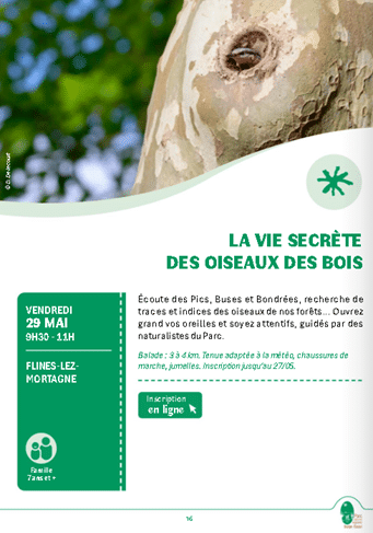Organisée avec l’accompagnement de naturalistes du Parc, cette sortie permettra aux participants d’observer et d’écouter les espèces présentes en milieu boisé, comme les pics, buses ou bondrées, mais aussi de repérer les traces et indices laissés par la faune.