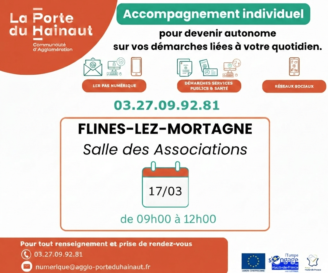 Marine Bosquillon, médiatrice numérique, sera présente en Salle des Associations de Flines-lez-Mortagne afin de vous accompagner en toute confidentialité et sécurité.