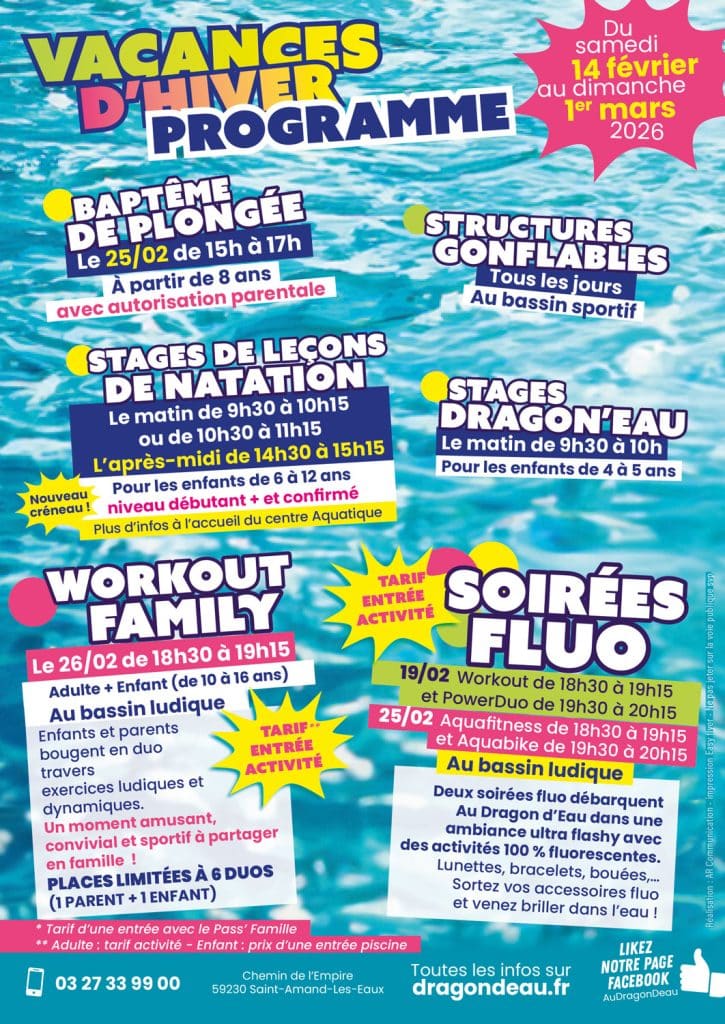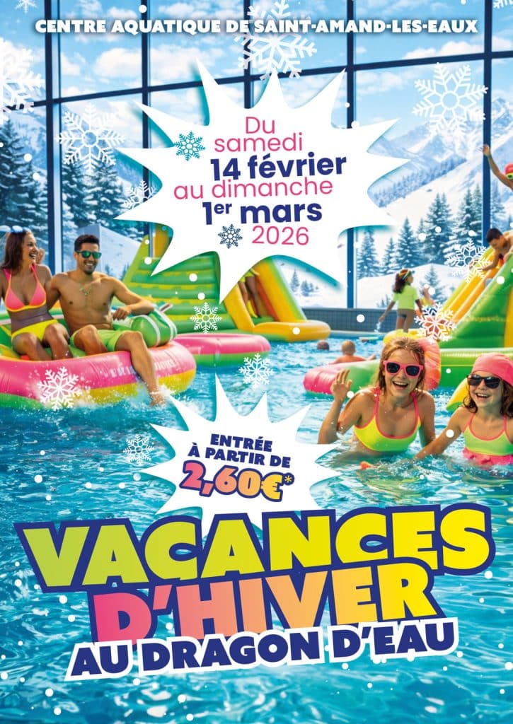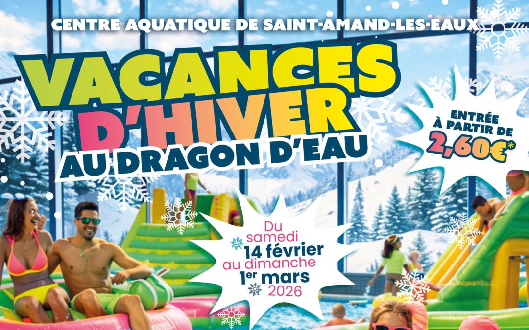Du samedi 14 février au dimanche 1er mars 2026, le Centre Aquatique Dragon d’Eau vous accueille pour des vacances d’hiver sous le signe de l’eau et de la convivialité ! Que vous soyez enfants, familles ou sportifs, un programme varié vous attend.